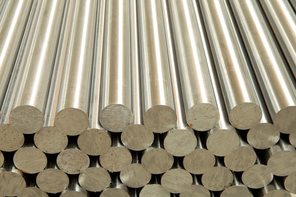 Bundle of stainless steel round bar stock with polished finish, available for purchase at Alcobra Metals in Spokane, WA